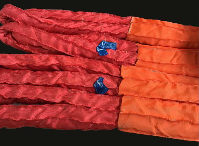 柔性吊裝帶保護套的設計一則是為了像扁平吊裝帶那樣增加大噸位合成纖維吊裝帶帶體與被吊物體的接觸面積,以此增高起重吊裝作業(yè)的平穩(wěn)性;二則是為了發(fā)揮圓形吊裝帶護套材質聚酯纖維耐磨性好的作用,延長吊裝帶的使用周期。